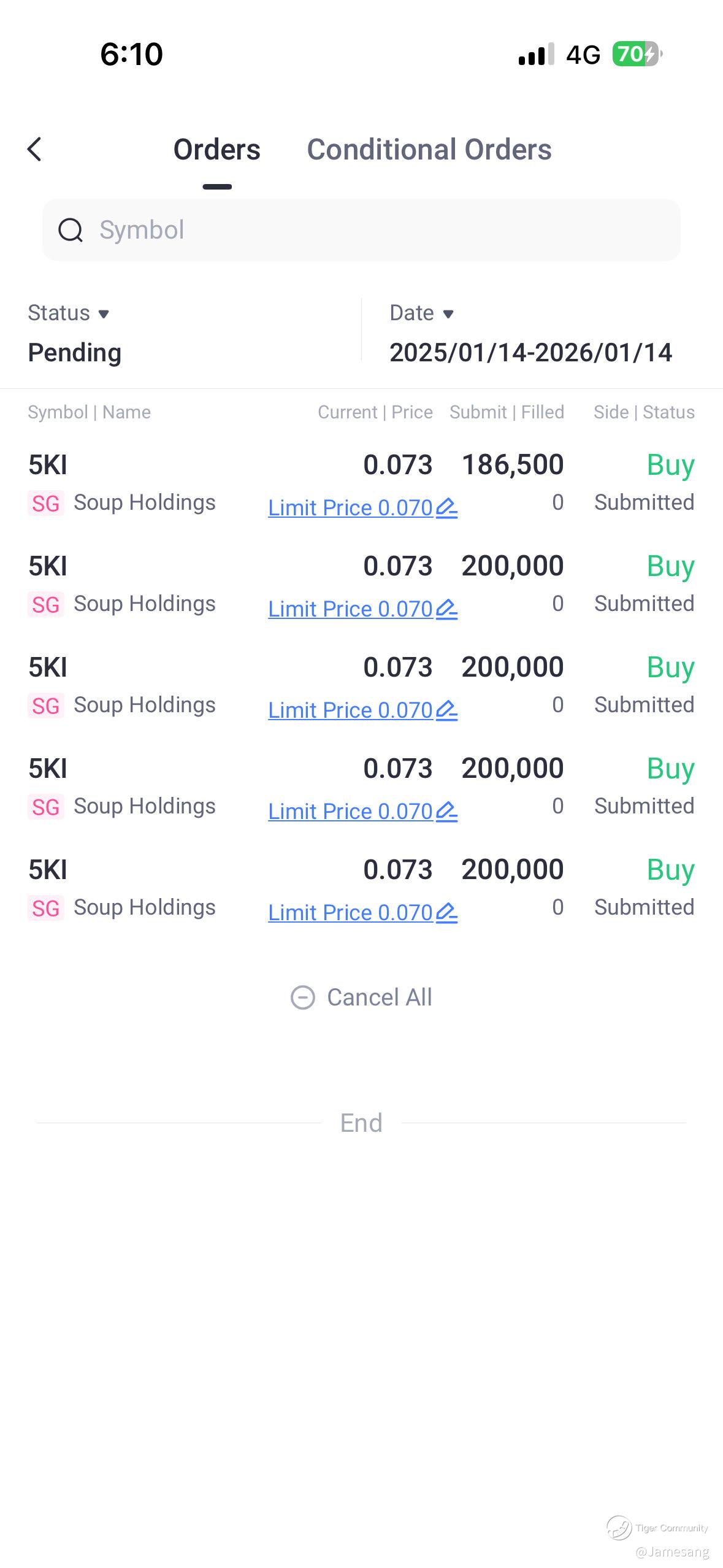 $Soup Holdings(5KI.SI)$ I have placed 1 million share order to buy soup restaurant shares at 7 cents. I expect paper hands to sell 300,000 shares to me because I sold 300,000 shares at 7.6 cents last week.