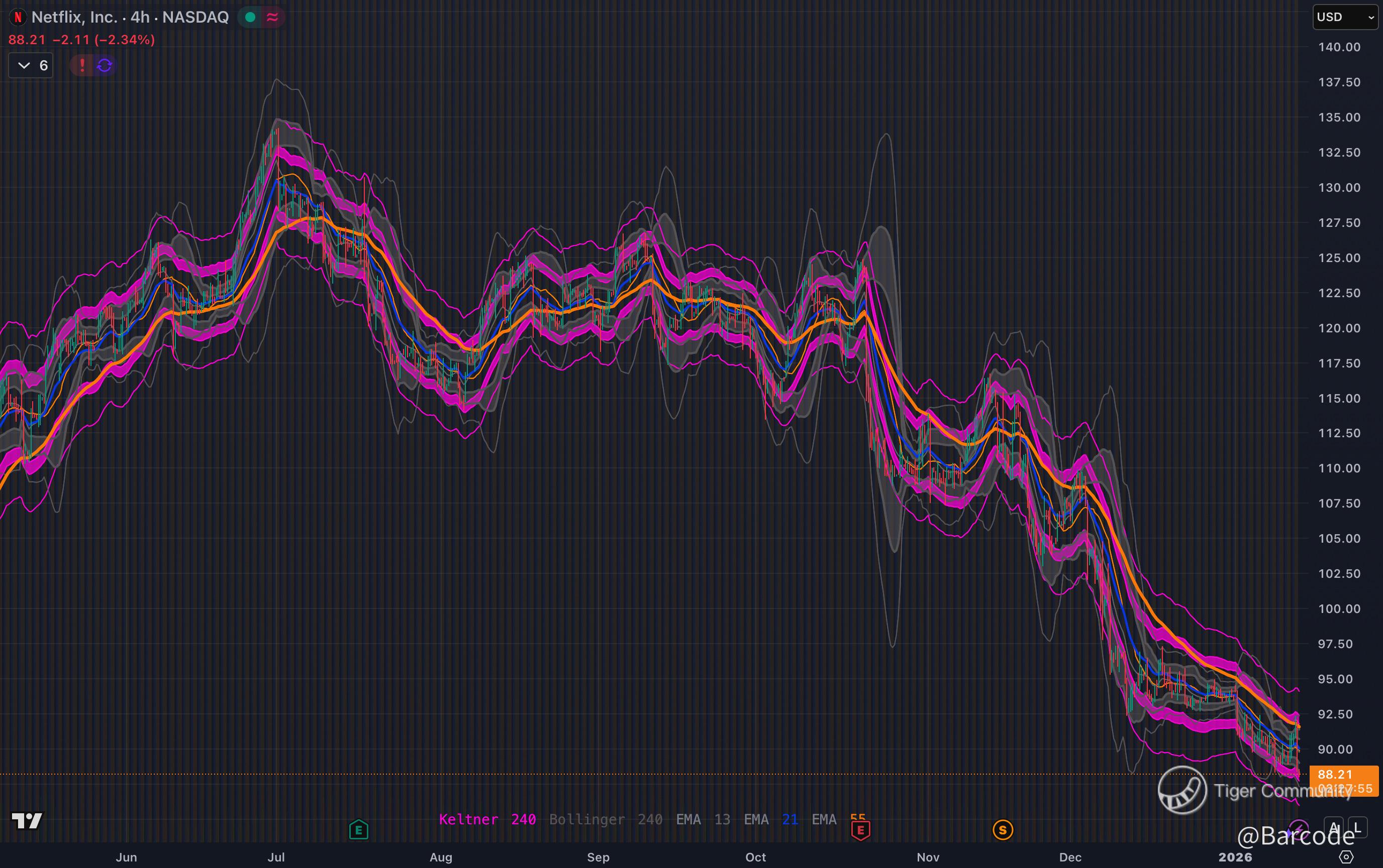 Netflix is compressing at the lower Keltner and Bollinger bands on the 4H chart with EMA 13, 21 and 55 stacked bearishly but flattening, a classic late-trend exhaustion signal. The $83 to $90 zone is heavy support built on prior volume and open interest. The first regime shift is $95. A reclaim of that level flips structure, pulls price back into the mid-channel, and opens a liquidity path toward $102 and then the $110 shelf.