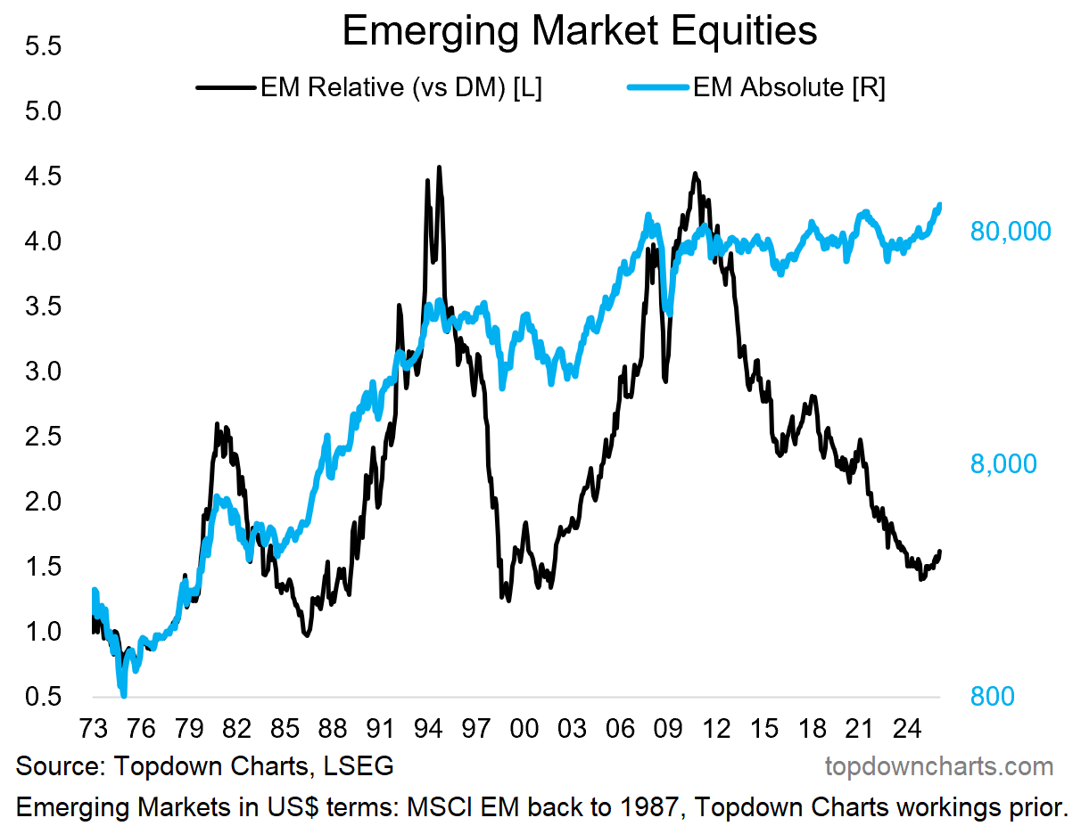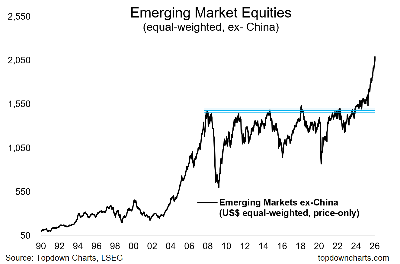 The below chart is an equal-weighted index I’ve put together using EM country index returns in US$ and excluding China (although I would note the outlook for Chinese stocks is quite bullish). This is what you call a Brobdingnagian Breakout — a long period of ranging, consolidation, reform, resetting, base-building, and then a decisive breakout. Just look to the early-2000’s for how this type of breakout can unfold.