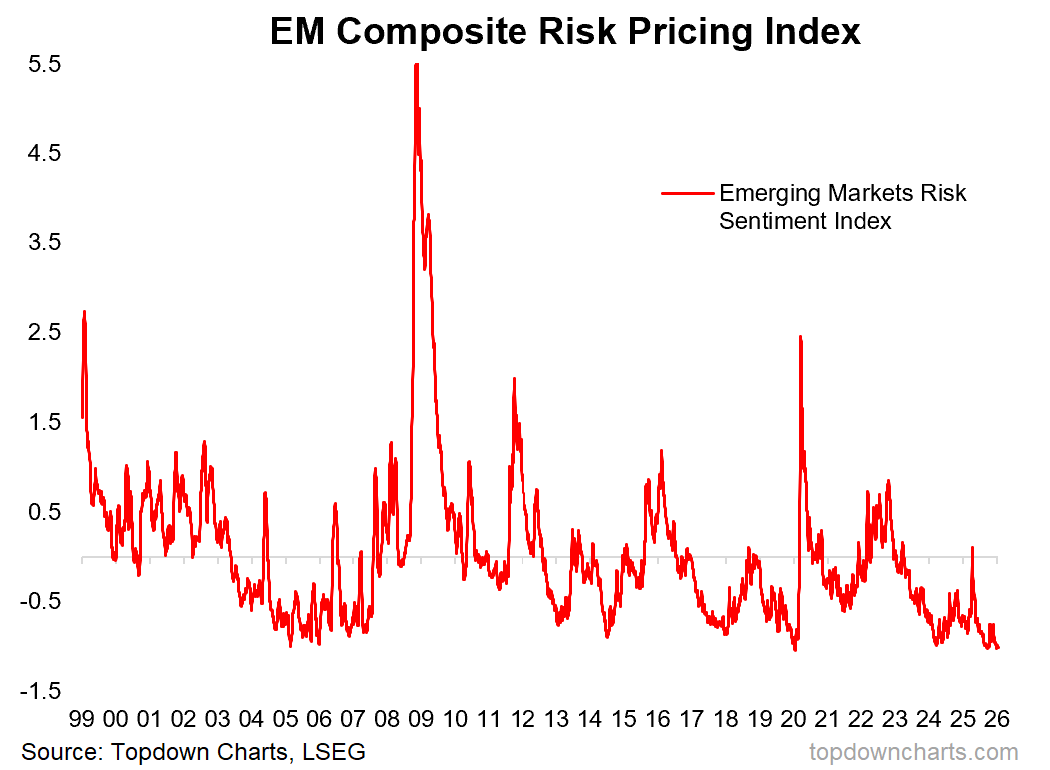 But it can also represent complacency at these sort of levels (and hence constitute a contrarian bearish signal). To that end, probably the key risks for emerging markets would be: USD resurgence (USD is currently in a bear market, which is supportive for EM), geopolitics (currently a mixed bag), global recession (currently there is evidence for the opposite; I expect global growth reacceleration).