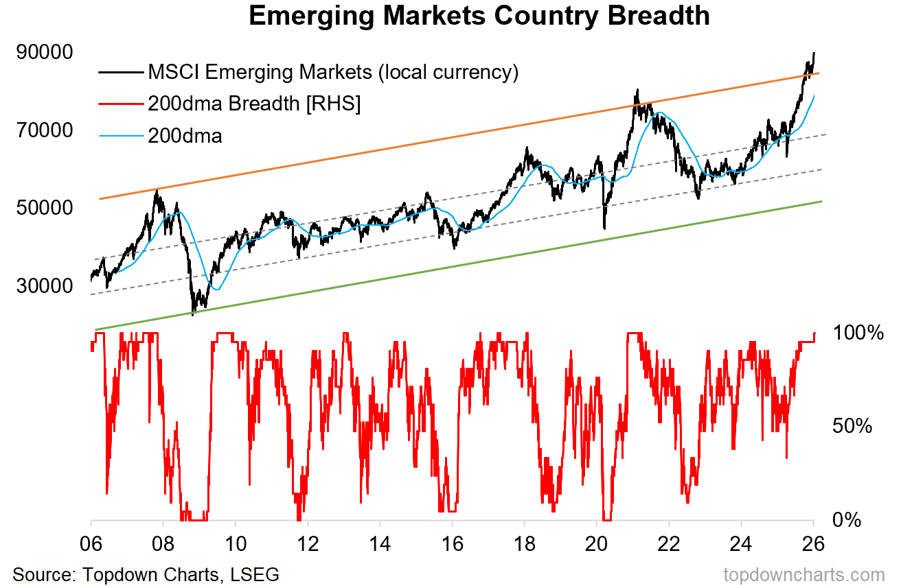 one of the most compelling things about the chart above is that it’s equal-weighted, so it’s not unduly driven by a single large country. Then add to that the country breadth chart below, which is showing the majority of EM local stock indexes running above their 200-day moving averages (i.e. uptrend) and a breakout of trend-channel for the MSCI EM index.