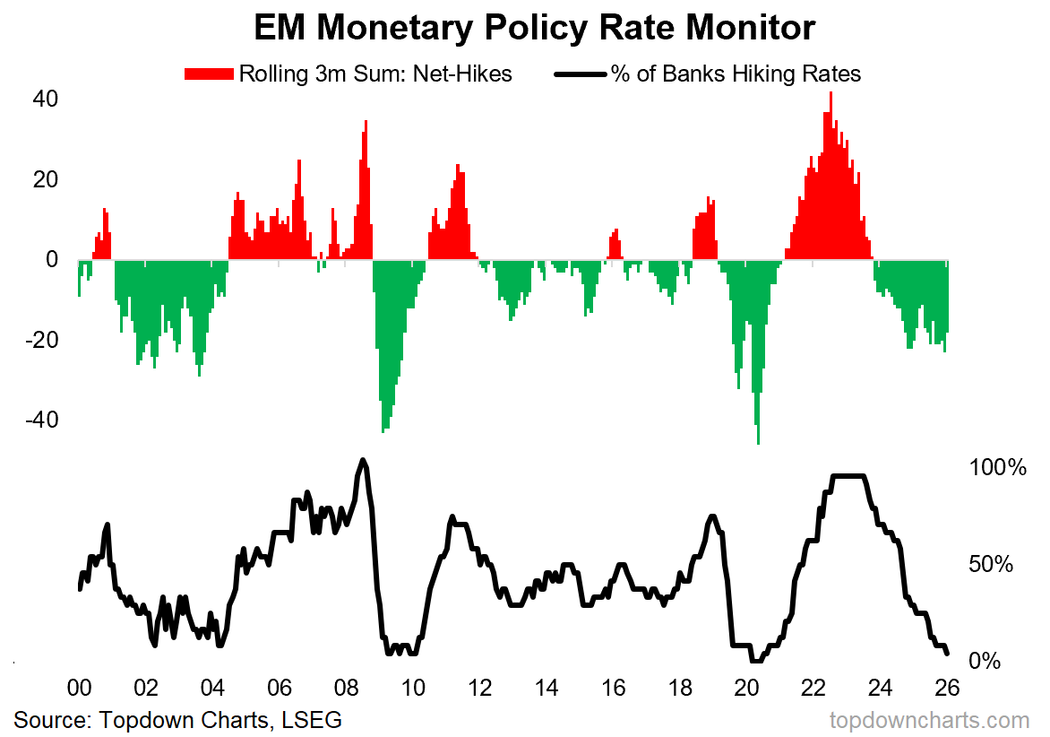 but then you have to ask, what’s behind the technical developments, and is it sustainable? One key cyclical force in play is the big pivot to easing in emerging markets. We are seeing increasing monetary tailwinds in force here (which also include a transition from bull to bear market in the US dollar, and generally buoyant funding conditions).