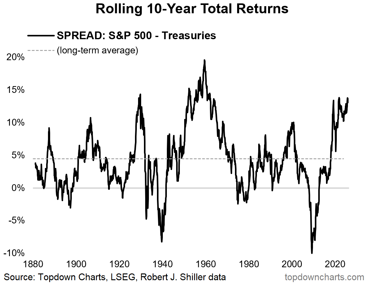 the rolling 10-year total return premium for stocks over and above that of bonds looks stretched vs long-term average, and it looks late in the cycle (and it does look cyclical).