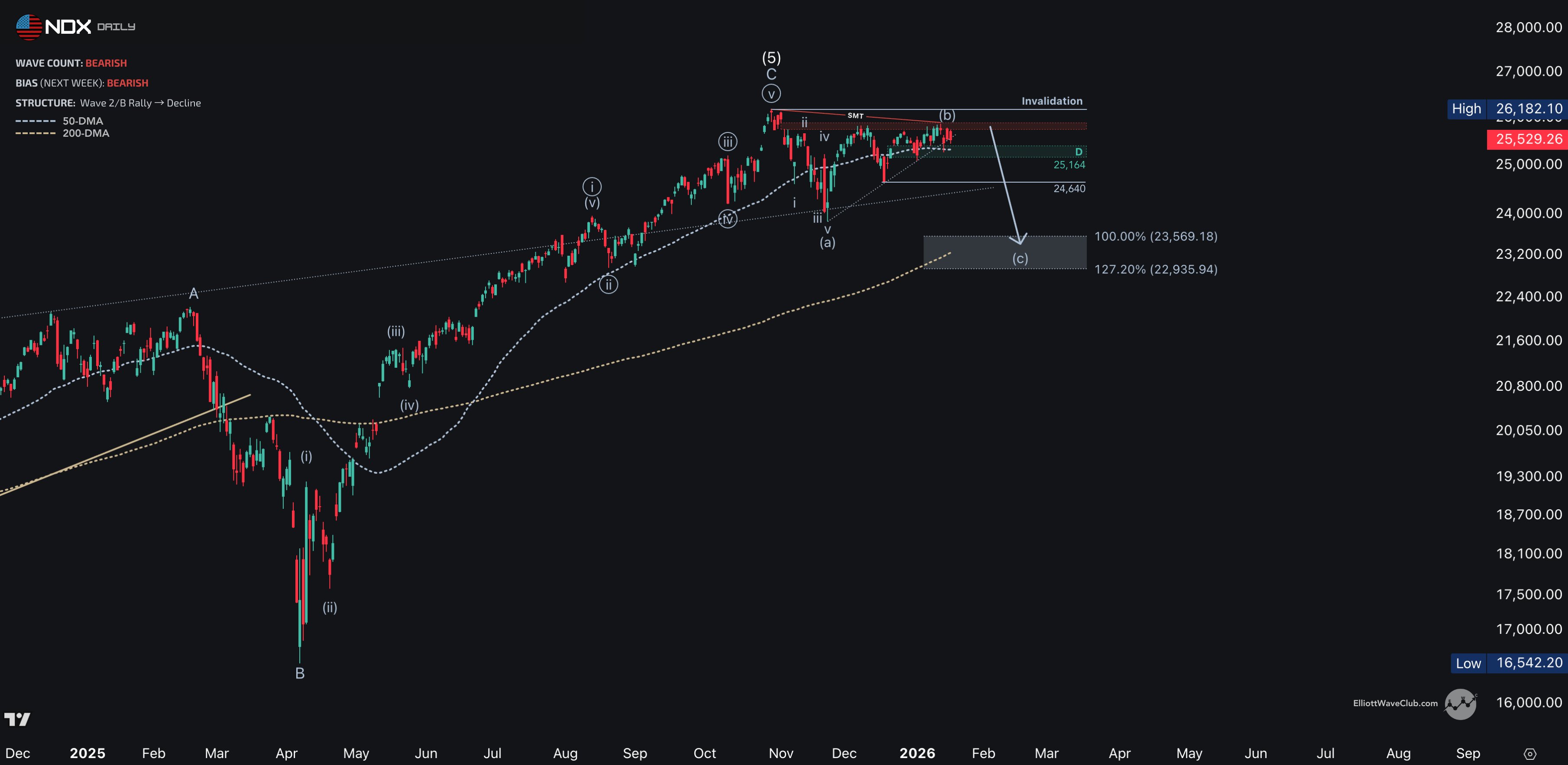Alt: This condition may persist into February. If SPX/IWM grind higher, NDX may consolidate rather than break immediately — but resolution still favors a larger move lower toward 23,500 once confirmed.