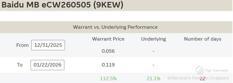 ✳Trending Baidu call warrant $Baidu MB eCW260505(9KEW.SI)$ (https://warrants.com.sg/tools/livematrix/9KEW) is consequently up more than 5 times compared to Baidu's share price performance - +112.5% from SGD 0.056 at the end of Dec to this afternoon's SGD 0.119 (as of 155PM)