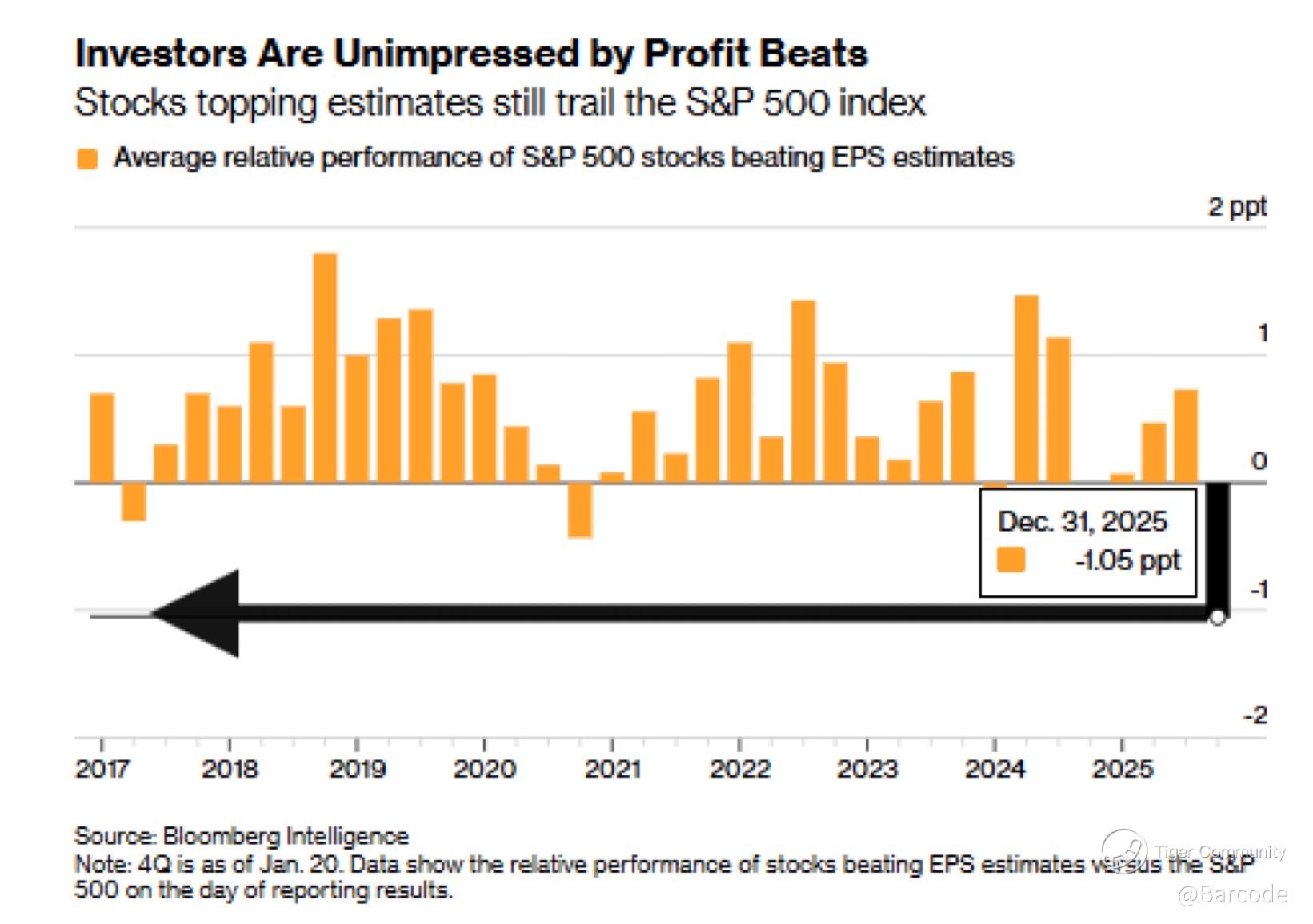 Bloomberg Intelligence notes ~81% of S&P 500 firms beat Q4 profit expectations, yet stocks beating EPS are underperforming the index by ~1.1 percentage points, the worst relative showing since 2017. This market is rewarding liquidity, positioning, and factor exposure more than headline earnings beats.