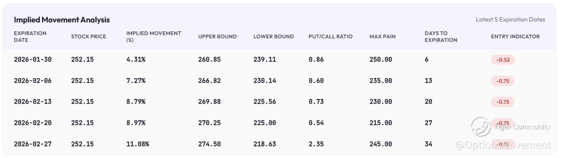 $Boeing(BA)$ reports Q4 2025 earnings Monday, January 27, before the bell. Consensus calls for a loss of $0.37 to $0.45 per share on $22.4 billion in revenue. Our proprietary Entry Indicator sits at -0.52, flagging structural weakness despite the stock trading near 52-week highs. The options market prices in a 4.31% earnings move. That's your corridor: $260.85 to $239.11. The stock sits at $252.15, just $2.15 above Max Pain at $250. Dealers have the magnet turned on.