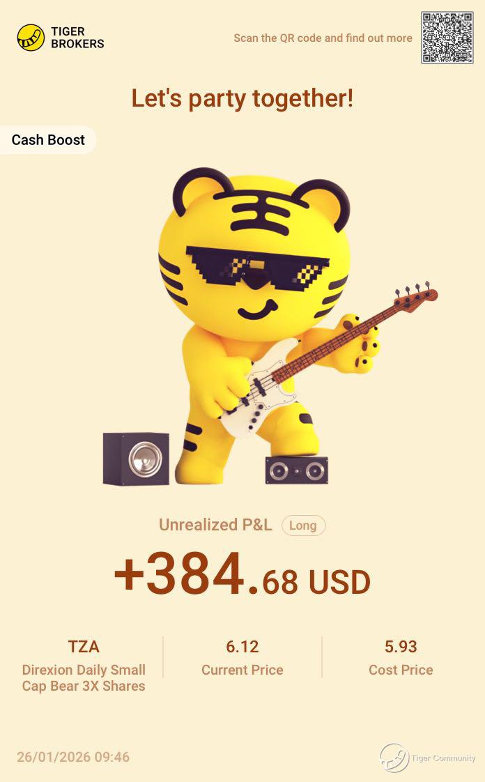 $Direxion Daily Small Cap Bear 3X Shares(TZA)$ This run on TZA really nailed the market’s pullback — the leverage amplified the gains from the downmove, and watching the profit climb has been thrilling. Making money on the downside isn’t easy, so this one feels extra good!