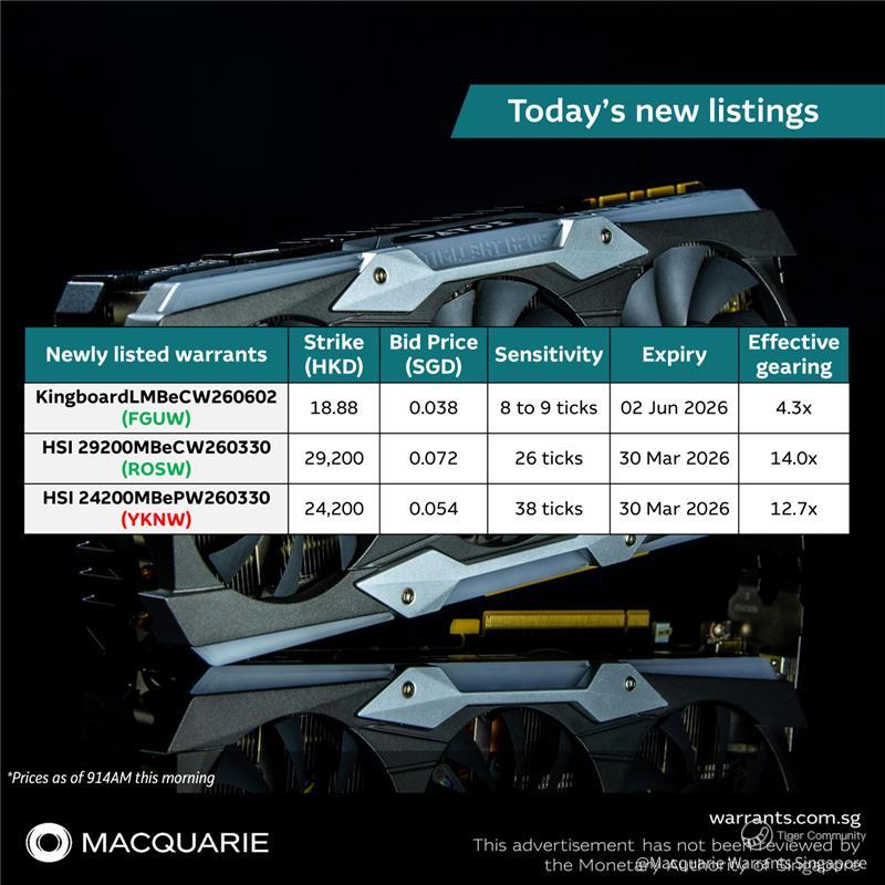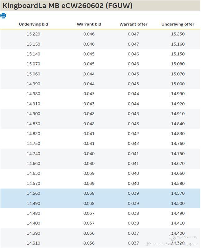 ✳Macquarie’s new Kingboard call warrant FGUW (https://warrants.com.sg/tools/livematrix/FGUW) costs SGD 0.040 while Kingboard trades at HKD 75.90, and will move approximately 4.3% more than Kingboard based on its effective gearing level of 4.3x as of 914AM this morning