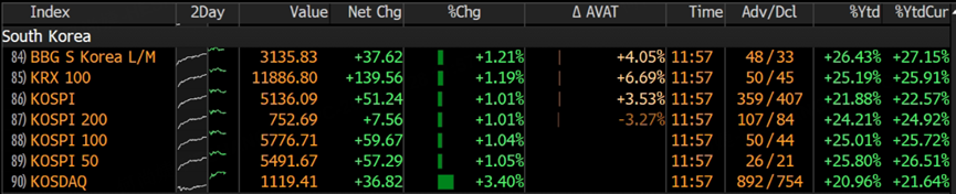 South Korea's large-cap indices posted even stronger gains, with the KOSPI 100 index rising over 25% year-to-date and the KOSPI 50 index climbing more than 26%.