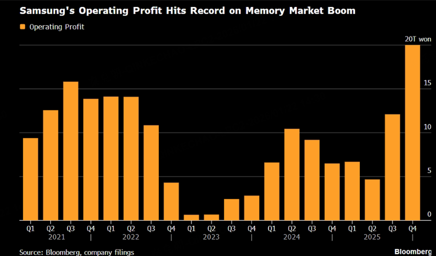 For instance, Samsung Electronics' operating profit in the fourth quarter of last year reached 20 trillion won, a staggering 208% year-on-year increase, far exceeding analysts' expectations of 17.8 trillion won.