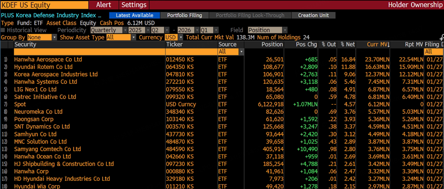 $PLUS Korea Defense Industry Index ETF(KDEF)$ : Smaller in scale but focused on the defense industry. Amidst the current global turmoil and frenzied military spending expansion, KDEF has surged 30% year-to-date, significantly outperforming ewy. Additionally, its holdings have limited exposure to semiconductors, meaning it faces less downside risk should the AI bubble burst: