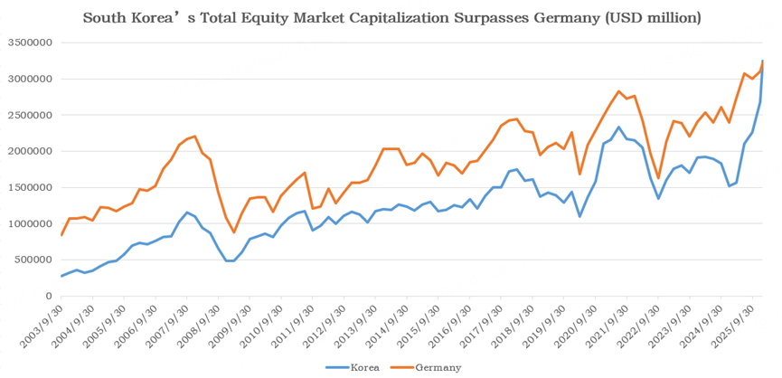 Yesterday, South Korea's stock market reached a total market capitalization of $3.25 trillion, surpassing Germany's $3.22 trillion to become the world's 10th largest stock market!