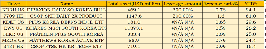 Against this backdrop, Korean ETFs have shone brightly: $Direxion Daily MSCI South Korea Bull 3x Shares(KORU)$ has delivered over 94% returns this year, $南方两倍做多海力士(07709)$ has surged 61%, $PLUS Korea Defense Industry Index ETF(KDEF)$ has gained nearly 30%, and $韩国ETF-iShares MSCI(EWY)$ has climbed over 26%.