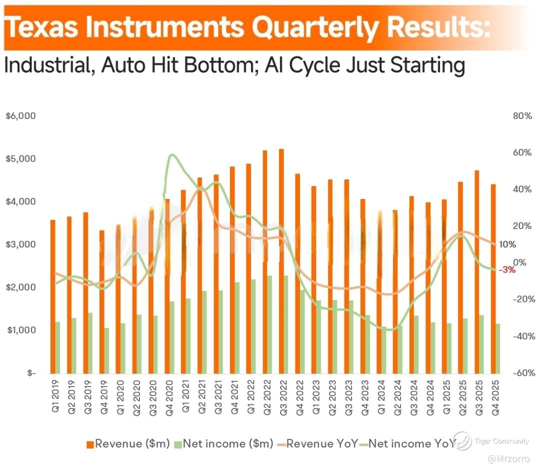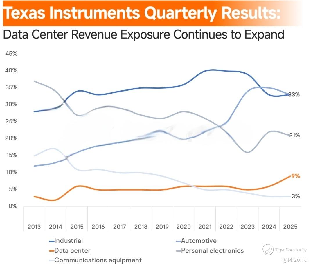 Management said data center revenue grew about 70% year over year in Q4, and that data center was 9% of total 2025 sales. Crucially, $Texas Instruments (TXN.US)$ said it will break out data center sales separately going forward. That is how an AI spillover narrative turns into a line item that can be modeled.