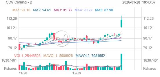 As of 2026-01-28, GLW closed at $109.74, surging +15.58% ($14.79) from the previous close. The stock is now just $0.25 from its 52-week high of $113.99.
