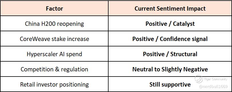 Sentiment takeaway: Improving to positive on regulatory risk, reducing one of the most significant overhangs on NVDA’s valuation.
