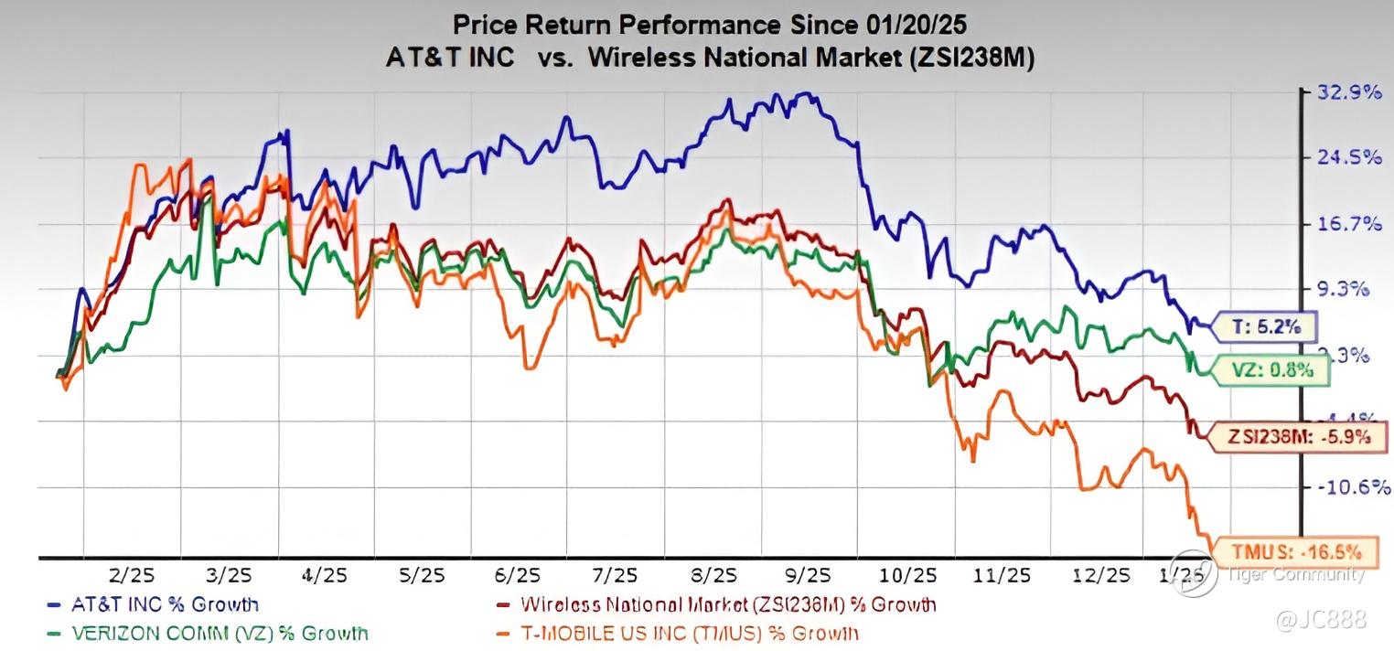 Over the past year (2025), AT&T has gained +5.2% against the industry’s decline of -5.9%, outperforming peers VA (+0.8%) and TMUS (-16.5%).(see above)