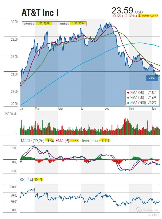 As of Fri, 23 Jan 2026, AT&T is trading below its key moving averages of 20-day ($24.07), 50-day ($24.69), and 200-day ($26.83).