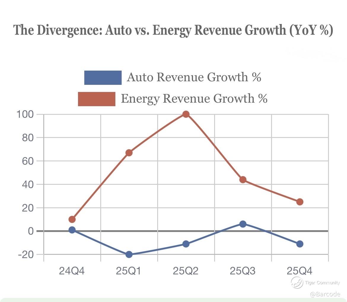 The divergence between Auto deceleration and Energy acceleration is now one of Tesla’s most important structural signals.