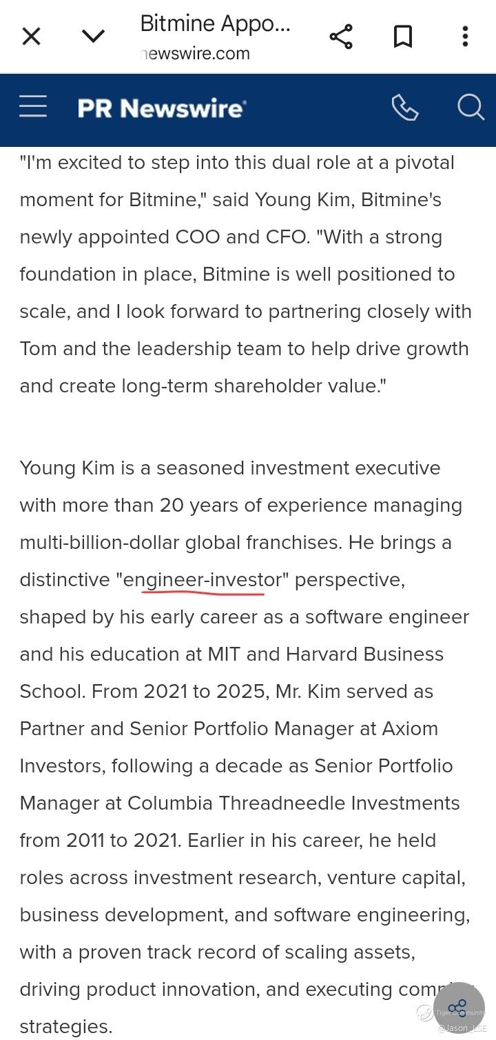 $BitMine Immersion Technologies Inc.(BMNR)$ DCA with conviction in BMNR. I am an engineer-investor, can appreciate & align with their new hired CFO/COO (Young Kim). Will share some of my research next, as I build up the case.😉