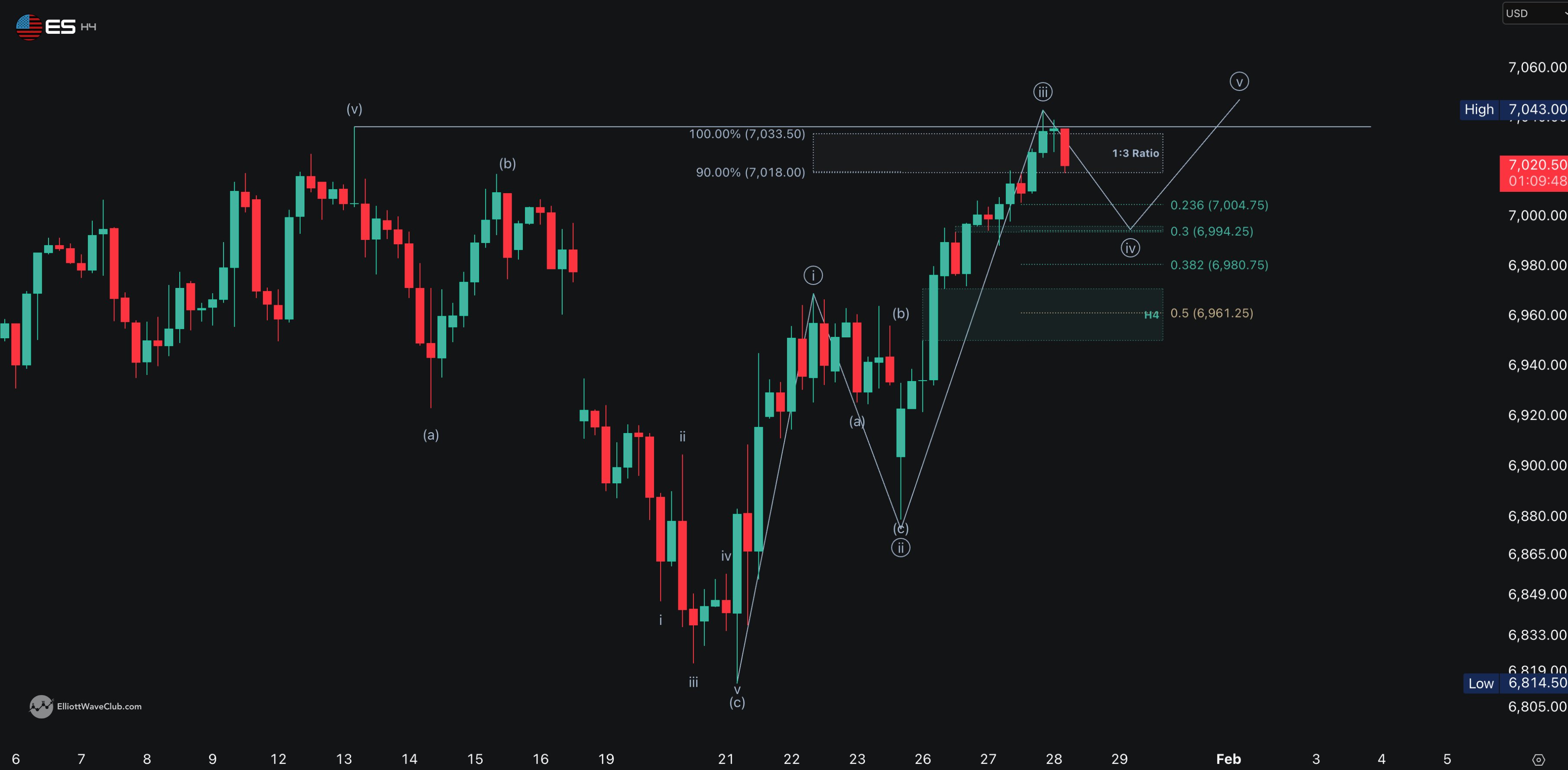 A Daily close below the FVG (6933) would warn of a pullback toward the 50% retrace of W5.