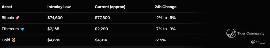 Crypto crew, buckle up – the king took a serious punch today! 😱 Bitcoin plunged as low as $74,600, marking its weakest level since early April 2025. Ethereum followed the bleed, touching $2,165 – a zone not seen since mid-2025. Ouch! 💥