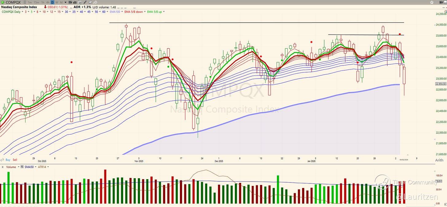 Yesterday was a textbook rotation day. Momentum stocks were hit hard as traders rushed for the exits, while defensive names quietly took the lead. The Nasdaq broke lower, yet the Dow pushed into fresh all-time highs! That split told the whole story. Risk was not leaving the market, it was just changing seats.