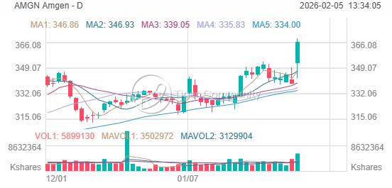 AMGN closed at $366.20 on 2026-02-04, surging +8.15% ($27.61). The session high of $368.75 matched the 52-week high.
