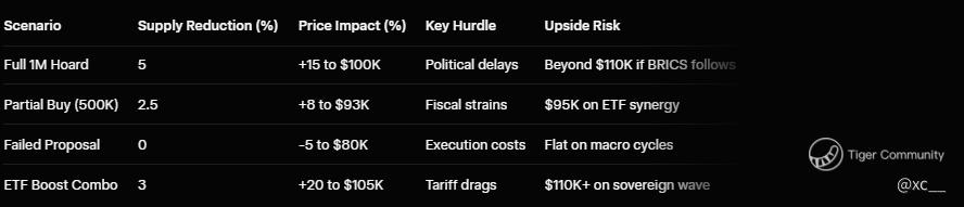 The proposal's headline-grab is undeniable β 1 million BTC accumulation over five years would rank Brazil among top holders like the US (210K BTC seized) and China (190K est), reducing float by 5% and potentially spiking scarcity if other nations follow. Steady sovereign buying could tighten supply like MicroStrategy's 650K hoard did for corporate adoption, reducing available coins for retail and ETFs by 2-3% yearly. But hurdles loom large: political gridlock in Brazil's Congress risks delays, fiscal strains from 4.5% GDP deficits crimp funding, and execution pitfalls like market impact from large buys could inflate costs 10-15%. Emerging economies like Argentina's BTC pivot add tailwind, pulling Latin America inflows 8%, but tariff escalations from Trump teases add wildcard drags of 5%. Geopolitical edges amp the play, with BRICS diversification from dollars boosting CB demand to 900 tonnes yearly for gold-like hedges. Crypto's $85K hold tests floors, but Brazil's bid could rocket Bitcoin to $90K if accumulation confirms.