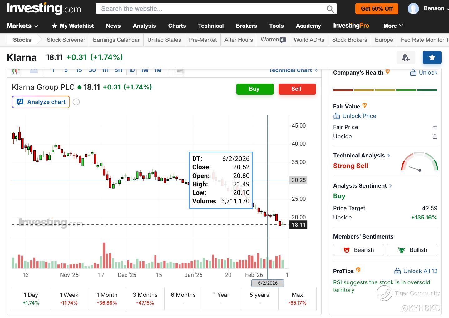According to technical analysis, Klarna currently holds a strong sell rating. However, analyst sentiment remains positive, with a buy recommendation. The price target is set at $42.59, which suggests a potential upside of 135.16%.