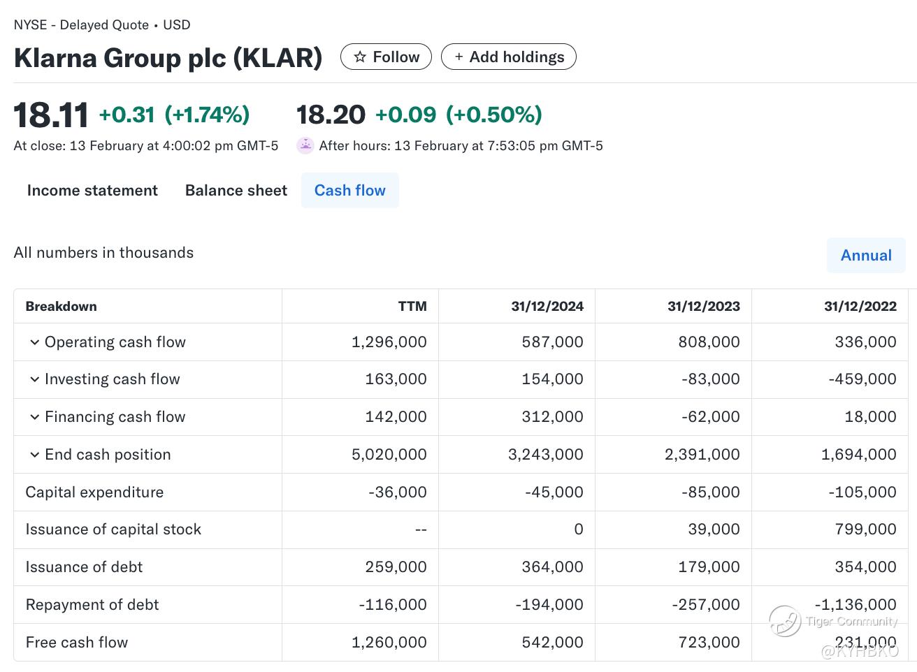 Despite higher revenues, Klarna continued to report operating losses. The company ended 2023 with an operating loss of $322 million, while the TTM figures show a reduced loss of $225 million, indicating some improvement in operational efficiency.