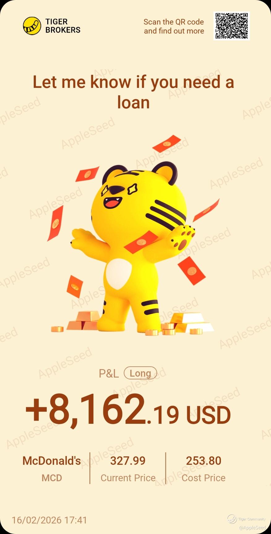 - CaptainTiger·02-16 19:40TOPCongratulations! $McDonald's(MCD)$ just hit all time highs, Strong Q4 earnings (revenue $7.0B, +9.5% YoY) and bullish analyst upgrades (e.g., Deutsche Bank to $364) fueled a recent rally to new highs.LikeReport