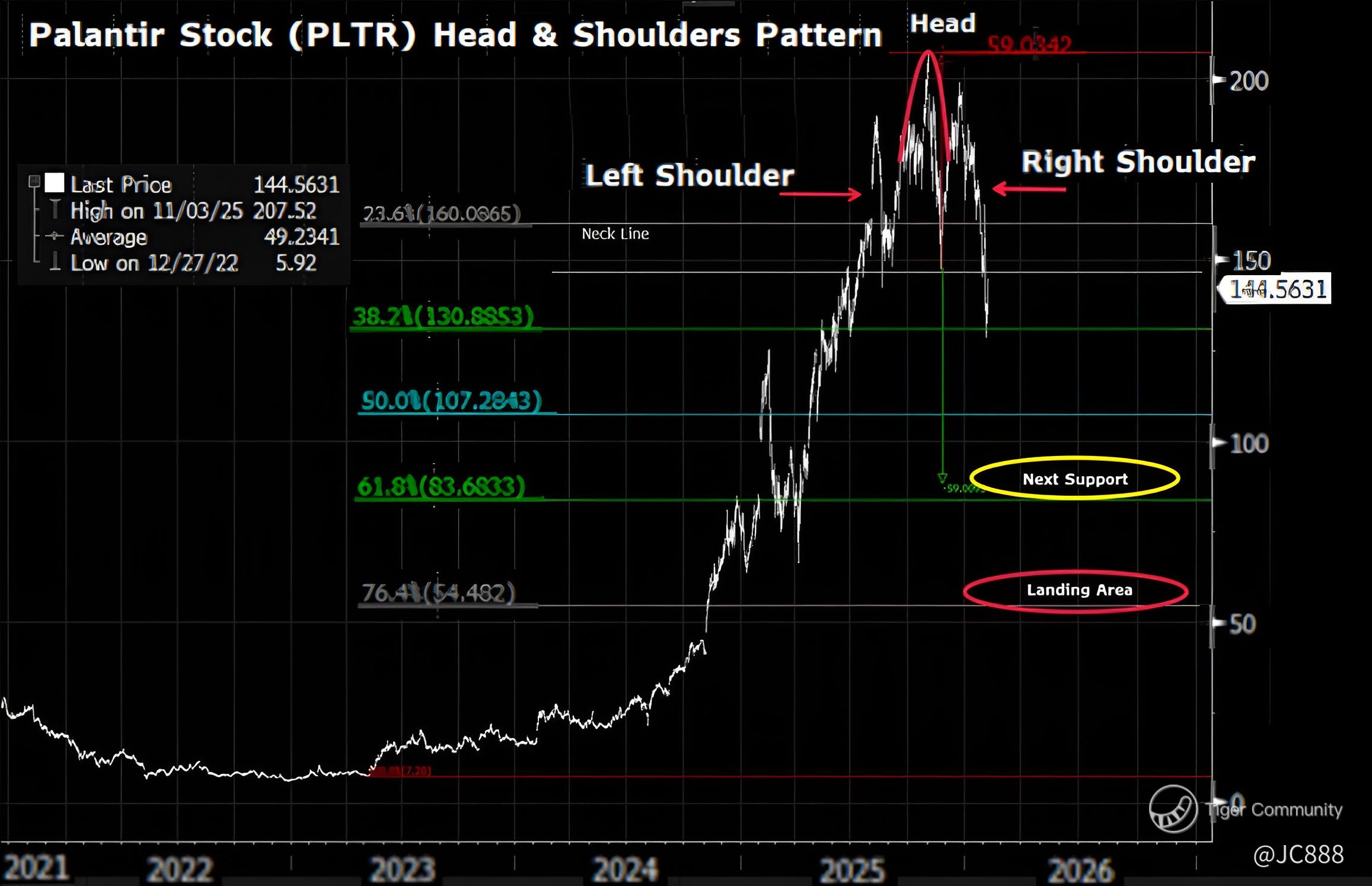 Based on this technical chart on X (see above), he believes this formation signals that PLTR could fall another -40% to -60% from current levels and he sees the next support level a little below $100, followed by a "landing area" slightly above $50.
