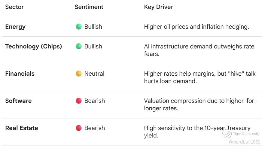 Rotation over Selling: We are not seeing a massive sell-off, but rather a "flight to quality." Investors are moving away from rate-sensitive sectors like Real Estate and Utilities (which are lagging) and into Energy and Mega-Cap Tech (Meta, Google, Nvidia) that boast strong cash flows and are less dependent on low rates.