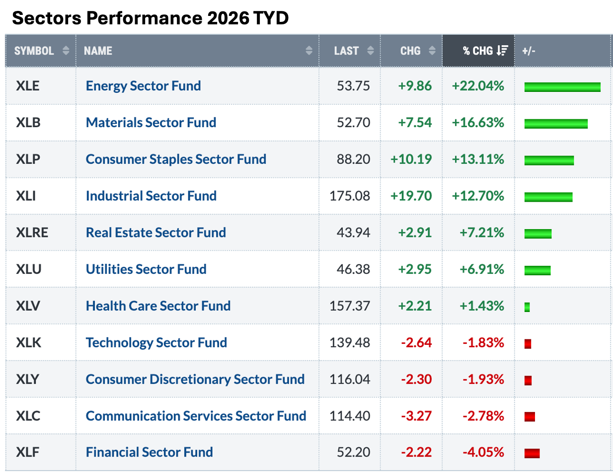 The performance data for 2026 Year-To-Date (YTD) indicates a clear rotation toward late-cycle and defensive sectors, signaling that the market may be navigating a late expansion phase.