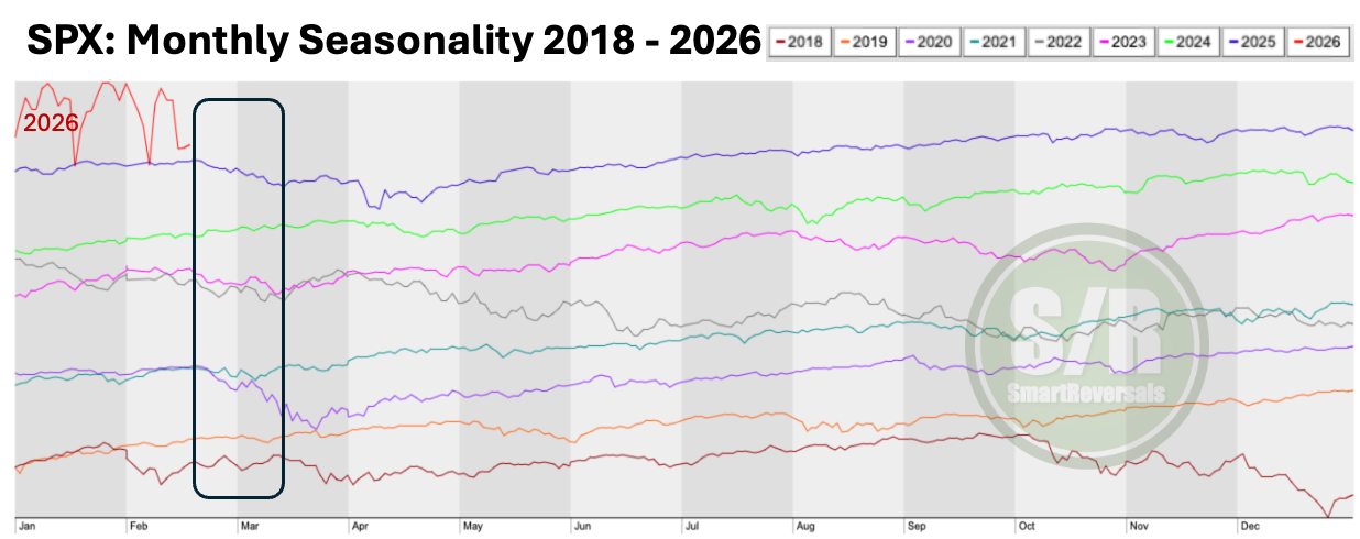 March Recovery: Seasonality charts show a historical tendency for a “dip” in late February, followed by a recovery in March as the market prepares for a typically bullish second quarter.