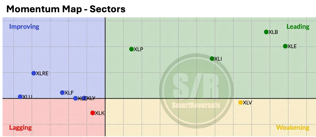 The Momentum Map confirms this transition. Energy $Energy Select Sector SPDR Fund(XLE)$ and Materials $Materials Select Sector SPDR Fund(XLB)$ are firmly in the "Leading" quadrant, exhibiting both high strength and positive momentum (potentially overbought).