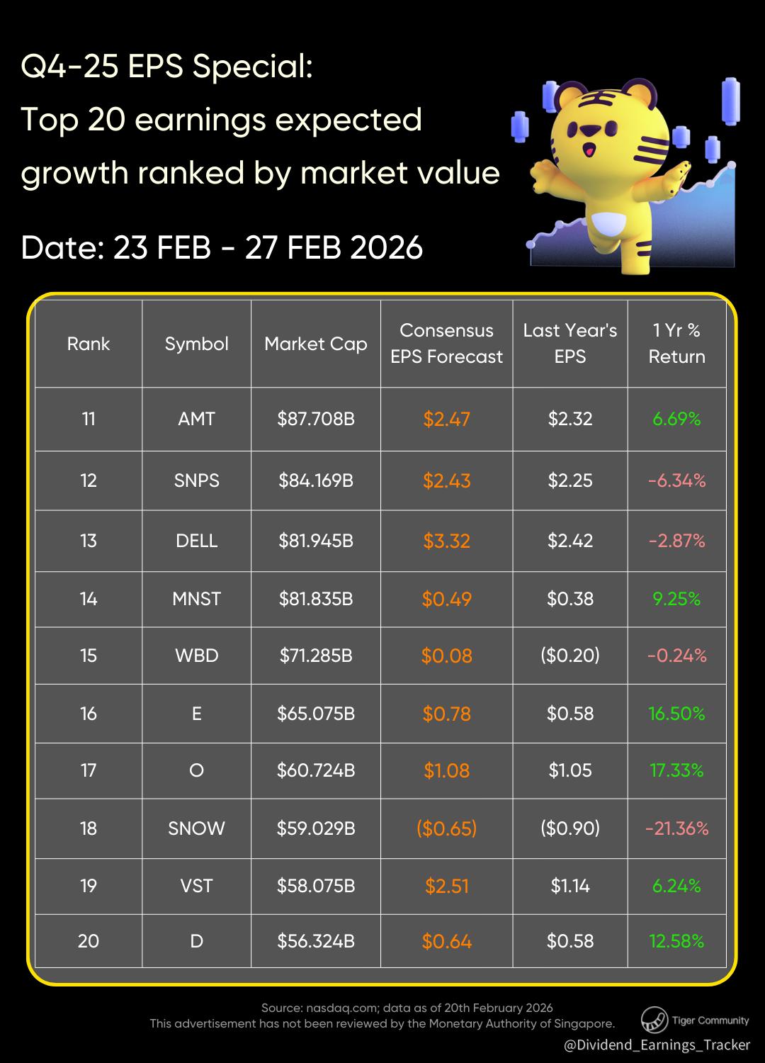 On February 23 to February 27, $NVIDIA(NVDA)$ , $Royal Bank of Canada(RY)$ , $TJX Companies(TJX)$ , $Toronto-Dominion Bank(TD)$ , $Lowe's(LOW)$ , $Intuit(INTU)$ , $Bank of Montreal(BMO)$, $Petroleo Brasileiro SA Petrobras(PBR)$ , $Bank of Nova Scotia(BNS)$ , $Canadian Imperial Bank of Commerce(CM)$ , $American Tower(AMT)$ , $SNPS$, $DELL$, $MNST$, $WBD$, $E$, $O$, $SNOW$, $VST$, and $D$ are expected to release their earnings, and consensus earnings per share forecasts are higher than data from the same period last year.