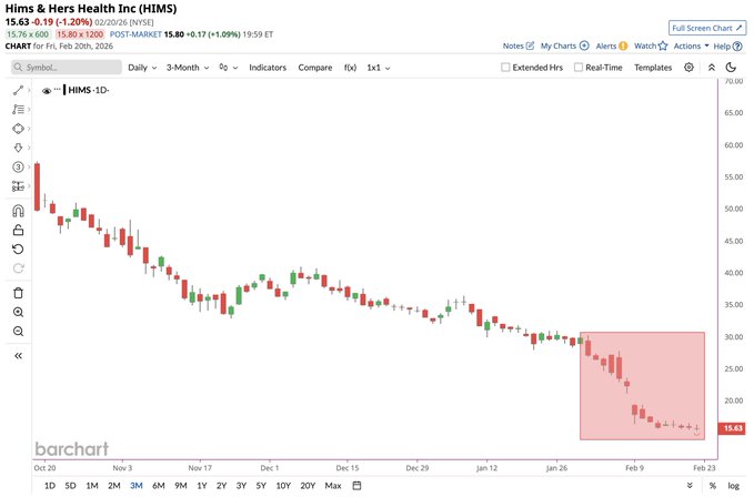 Hims & Hers Health $HIMS has now traded red in 14 of the last 15 days and lost almost 50% in value, its worst period in history 🚨🚨