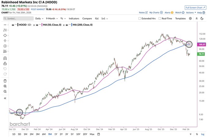 Robinhood $HOOD forms a Death Cross ☠️ for the first time since October 2023 🚨 The last one sent shares falling 13% over the next 3 weeks before a Golden Cross sent them soaring to the promised land 📈📈