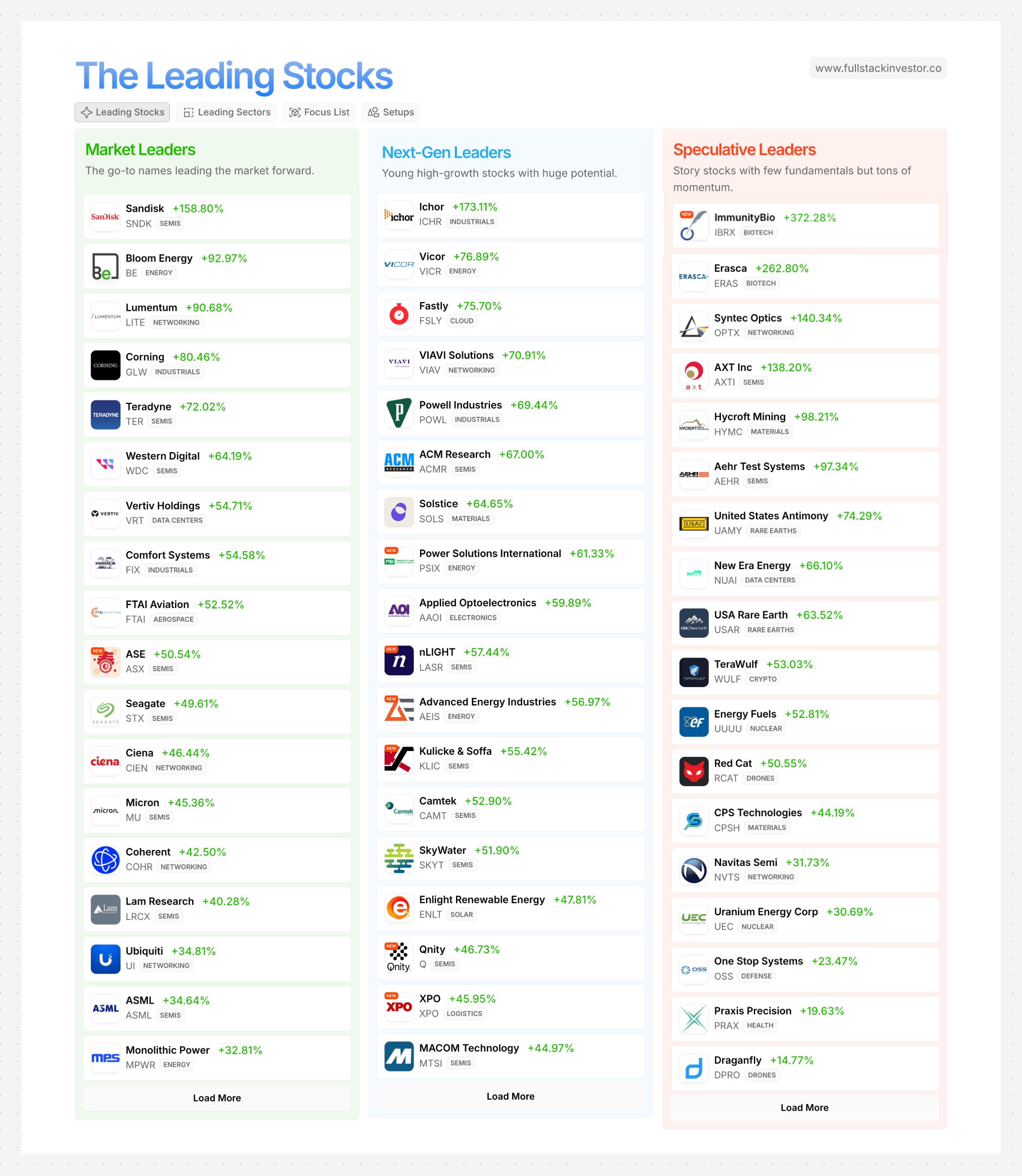 Market Leaders: $SanDisk Corp.(SNDK)$ $Bloom Energy Corp(BE)$ $Lumentum(LITE)$ $Corning(GLW)$ $Teradyne(TER)$ $Western Digital(WDC)$ $Vertiv Holdings LLC(VRT)$ $Comfort Systems USA(FIX)$ $ASE Technology(ASX)$ $Seagate Technology PLC(STX)$ $Ciena(CIEN)$ $Micron Technology(MU)$ $COHERENT(COHR)$ $Lam Research(LRCX)$ $Ubiquiti Inc.(UI)$ $ASML Holding NV(ASML)$