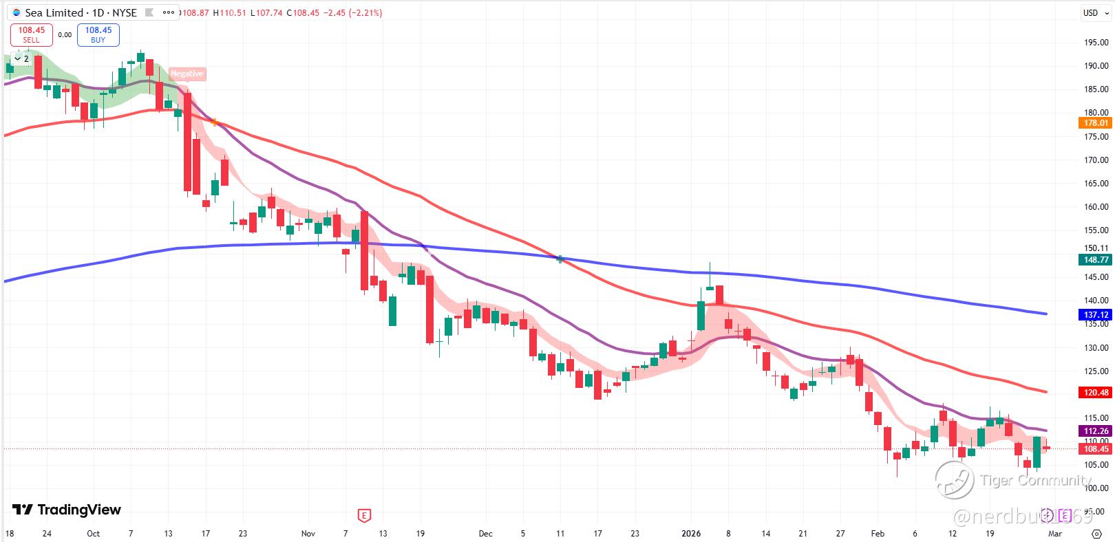 The Bear Case: The stock has underperformed the S&P 500 recently (-17.5% over the last month). If credit loss provisions for SeaMoney continue to climb faster than revenue, the "Strong Sell" rating from some analysts (like Zacks) may weigh heavily, leading to a break below psychological support at $100.