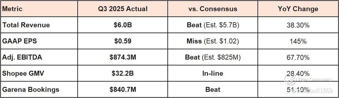 Shopee achieved record GMV and revenue, driven by a 53% surge in core marketplace revenue (fees and ads). However, EBITDA margins fell to 0.6% (from 0.8% in Q2). Management attributed this to aggressive investments in logistics (SPX Express) and buyer incentives to fend off TikTok Shop and Temu.