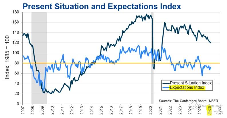 Confidence ticked up as consumers’ pessimistic expectations for the future eased marginally, although it remained well below the 4-year peak achieved in November 2024 of 112.8.
