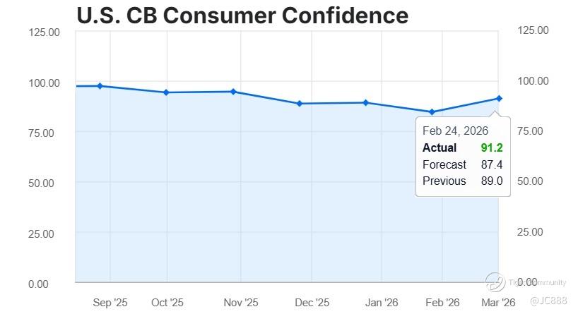 US consumer confidence rebounded more than expected in February 2026. (see below)