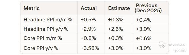 Core PPI rose +0.8% on a MoM basis, after gaining +0.6% in December 2025.