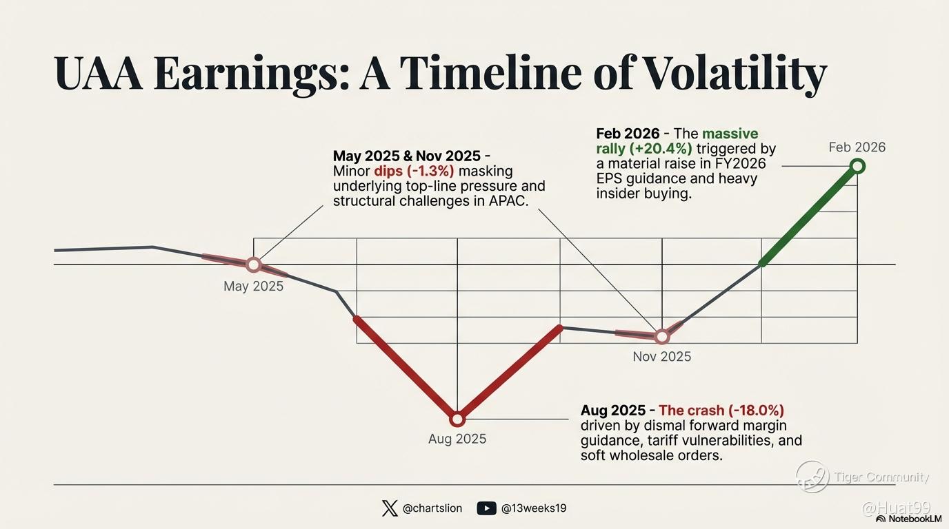 $UAA just posted a massive +20.4% post-earnings rally in Feb 2026, but getting here was a volatile ride.