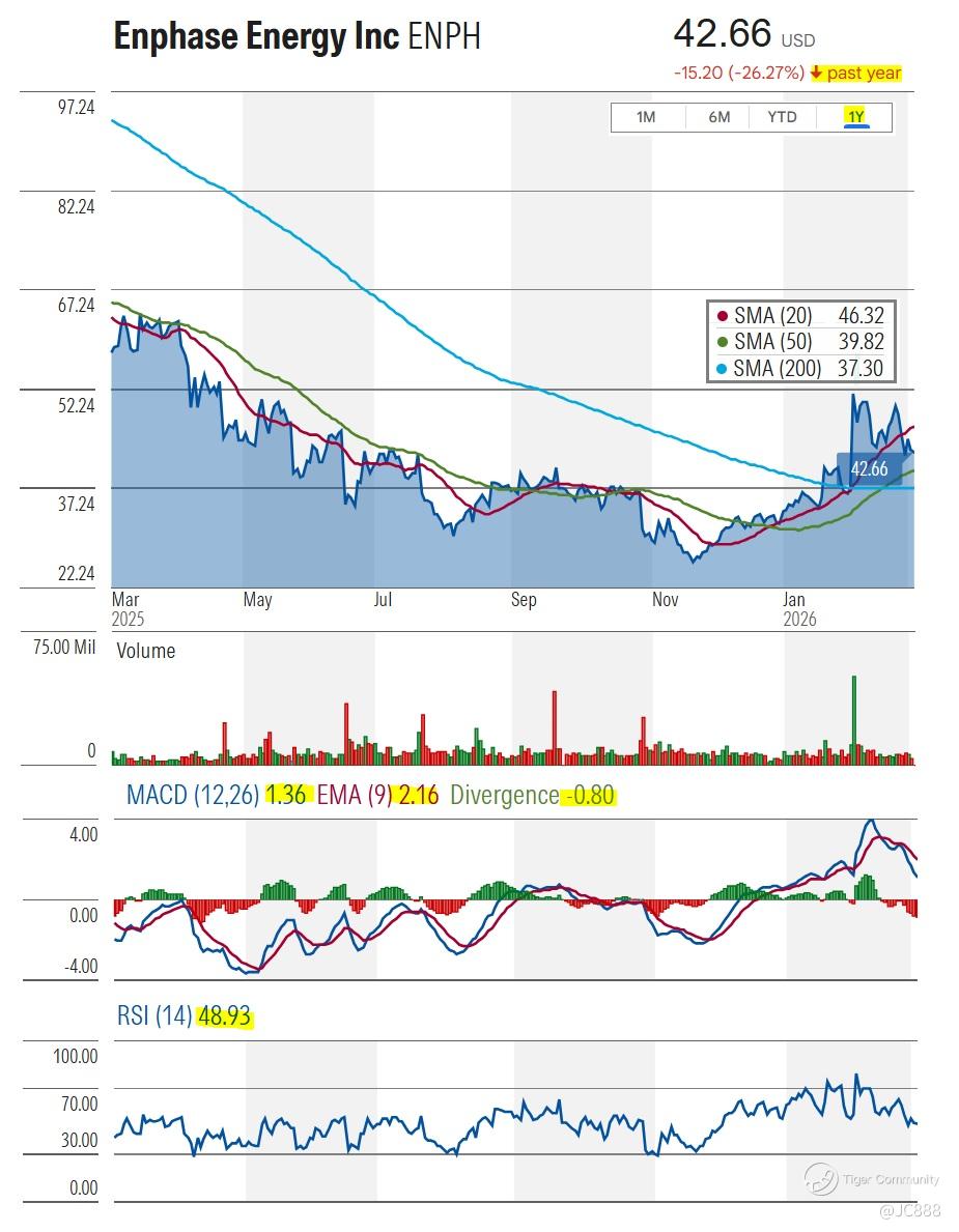 Its stock price is currently lower than its 20-day SMA ($46.32), after touching a recent high - hints at short-term weakness or profit-taking OR that ENPH is losing immediate momentum and may drop further toward the $40 level before finding support.