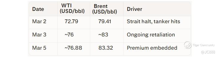 By March 3-5, WTI stabilized near $76-77 (±4% total), Brent ~$83 (±14%), with $Citigroup(C)$ forecasting $80-90 amid escalation risks.